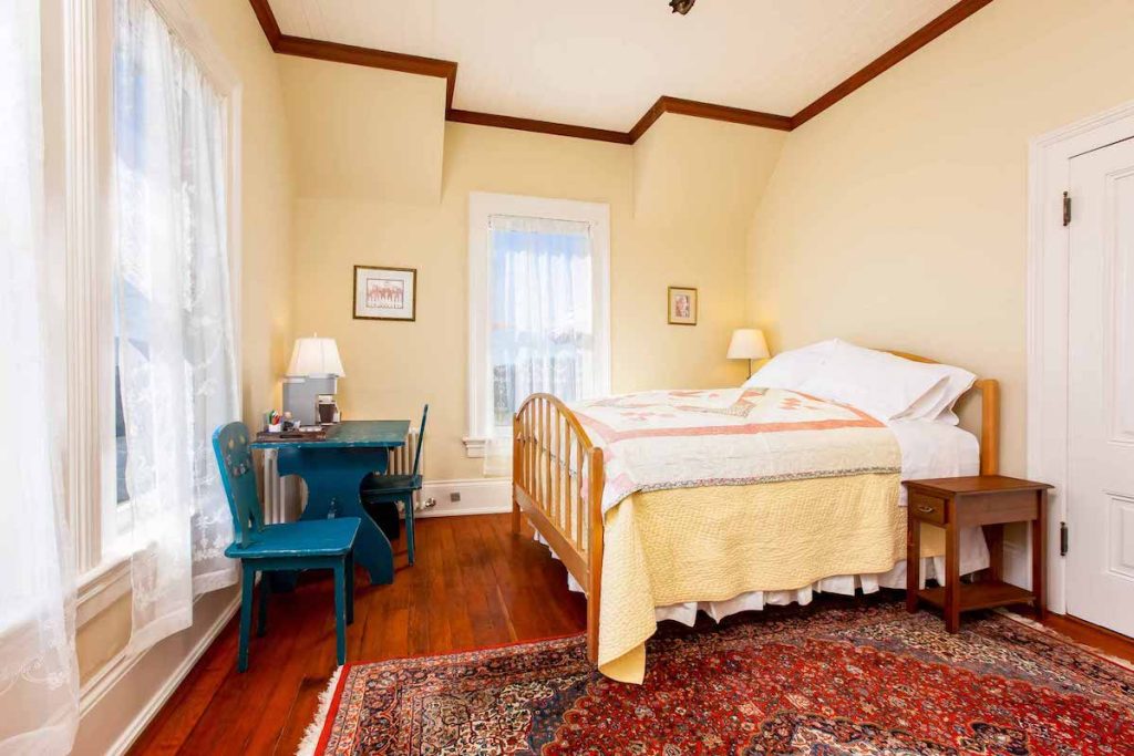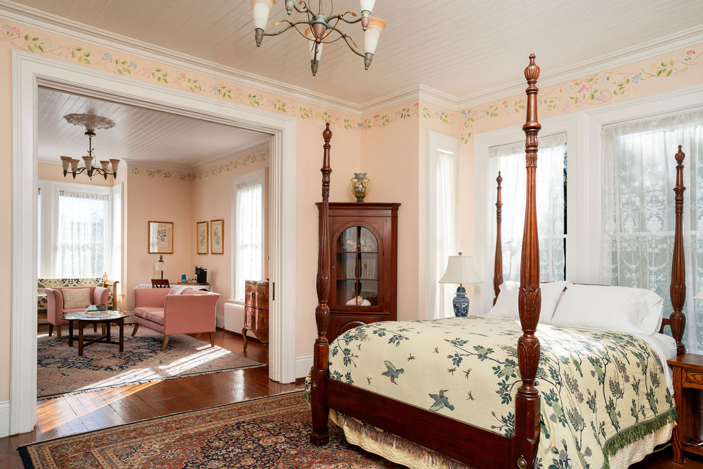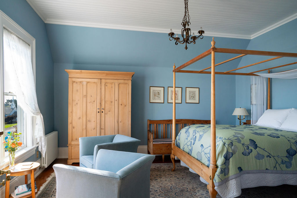 The Blair House’s most coveted room is Angela’s Suite. This lavish suite boasts two rooms, with ten-foot ceilings and bay windows. Unwind before bed in the cozy sitting room and enjoy the breathtaking vista of the village and ocean. Alternatively, relax in the spacious private bath, which showcases a clawfoot tub, shower, and other Victorian-era fittings. Finally, retire for the night in the magnificent mahogany four-poster queen bed.