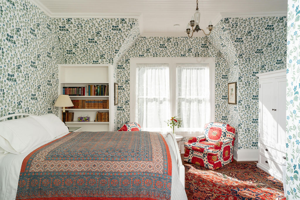 Florence’s room at Blair House with bed and sitting chairs floral wallpaper